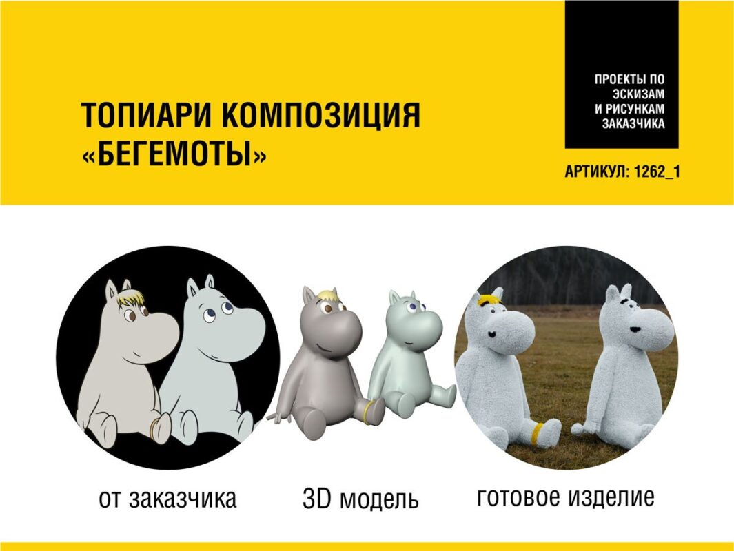 Для наших клиентов 3Д-проект разрабатывается бесплатно, при условии запуска топиари в производство. 3Д-дизайнер готовит макет будущего изделия по предоставленной фотографии и пожеланиям клиента. Работа над макетом ведется до тех пор, пока она не станет визуально соответствовать ожиданиям заказчика. Заказчик вносит символическую плату за разработку 3д модели, но после передачи проекта в производство, вся внесенная сумма идет в предоплату за саму фигуру. После утверждения 3д-проекта утверждаются точные сроки и материалы для создания фигуры, вносится предоплата за изготовление топиари.