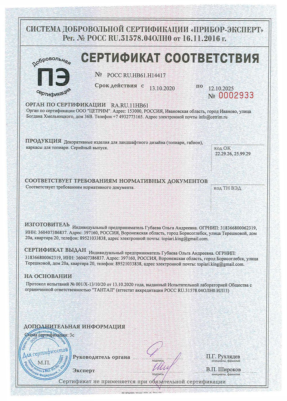 Теперь не только мы можем говорить, что изделия имеют высочайшее качество, сейчас об этом заявляют и сертифицированные органы. Мы со своей стороны хотим гарантировать лучшие топиари фигуры на рынке России и за его пределами для наших клиентов!