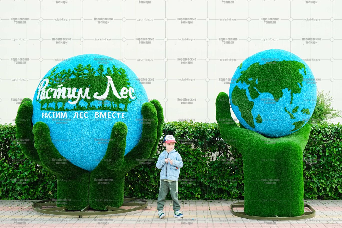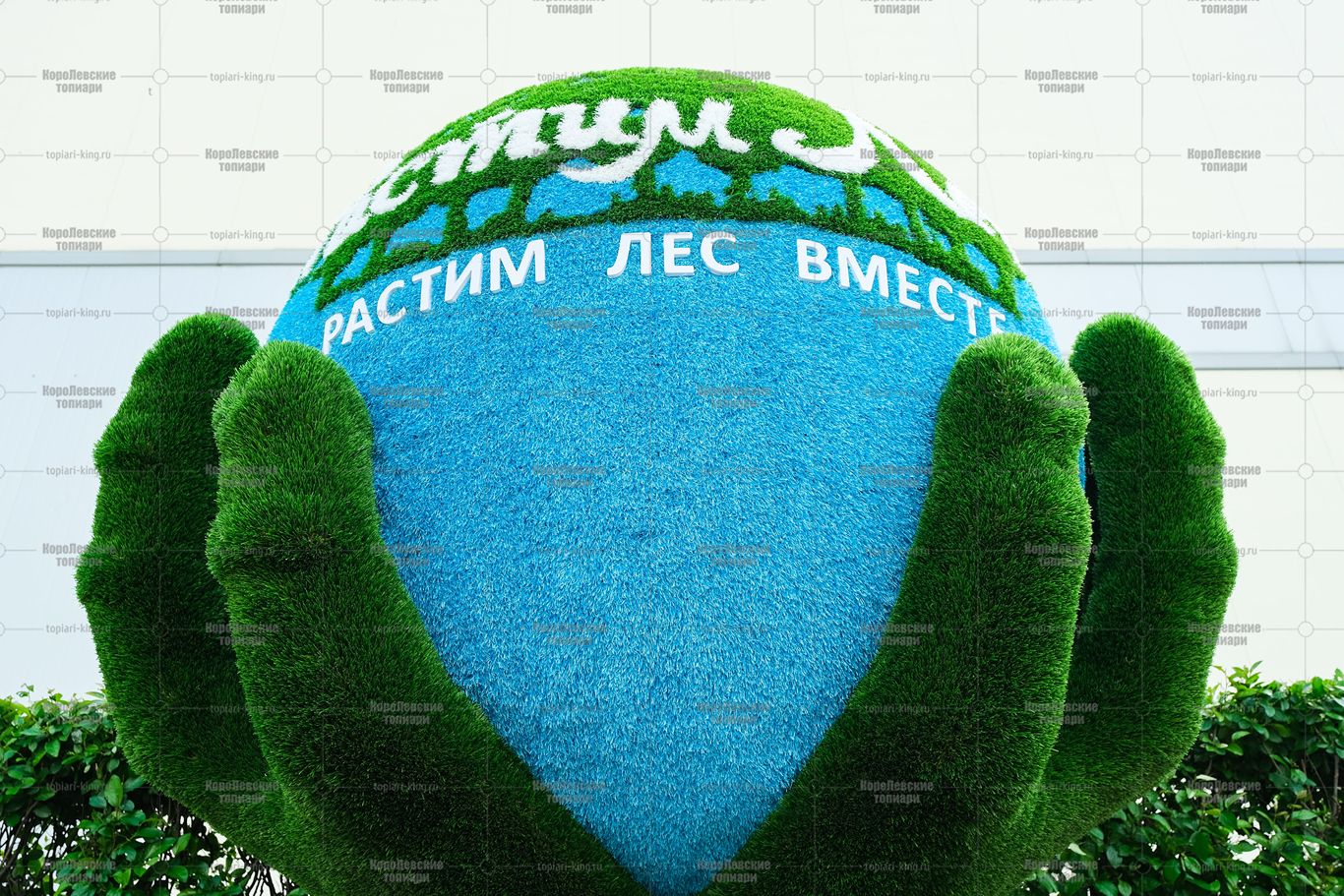 Топиари композиция земной шар в руках, с логотипом, модель 1 — газон Eco +Deluxe